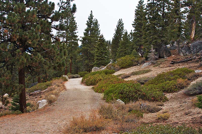 The trailhead for this hike is hard to find. It is a very small unmarked pull-out on the lake side of Highway 28 about two miles northwest of the intersection with U.S. Highway 50. An iron gate bars access to a dirt road leading down toward the lake. When you park, do not block the gate or you risk finding your ride has been towed away while you were off on your hike. Most of the dirt road dates from the day when this slope was logged to provide lumber for the Virginia City silver mines during the nineteenth century. It was the grade for the logging railroad that worked this part of the forest. A short way down the road there is a fork. To the left is the trail down to Prey Meadows. To the right is the trail down to Skunk Harbor. On this hike we headed down to Skunk Harbor, but I intend to go on down to the meadow some spring when the wild flowers are out. About a mile and a half from the highway one reaches Lake Tahoe and Skunk Harbor, the site of the Newhall family's lakeside retreat. I found it very easy to imagine the lavish parties that the Newhalls had here during the Roaring Twenties and wished that I could have seen one.